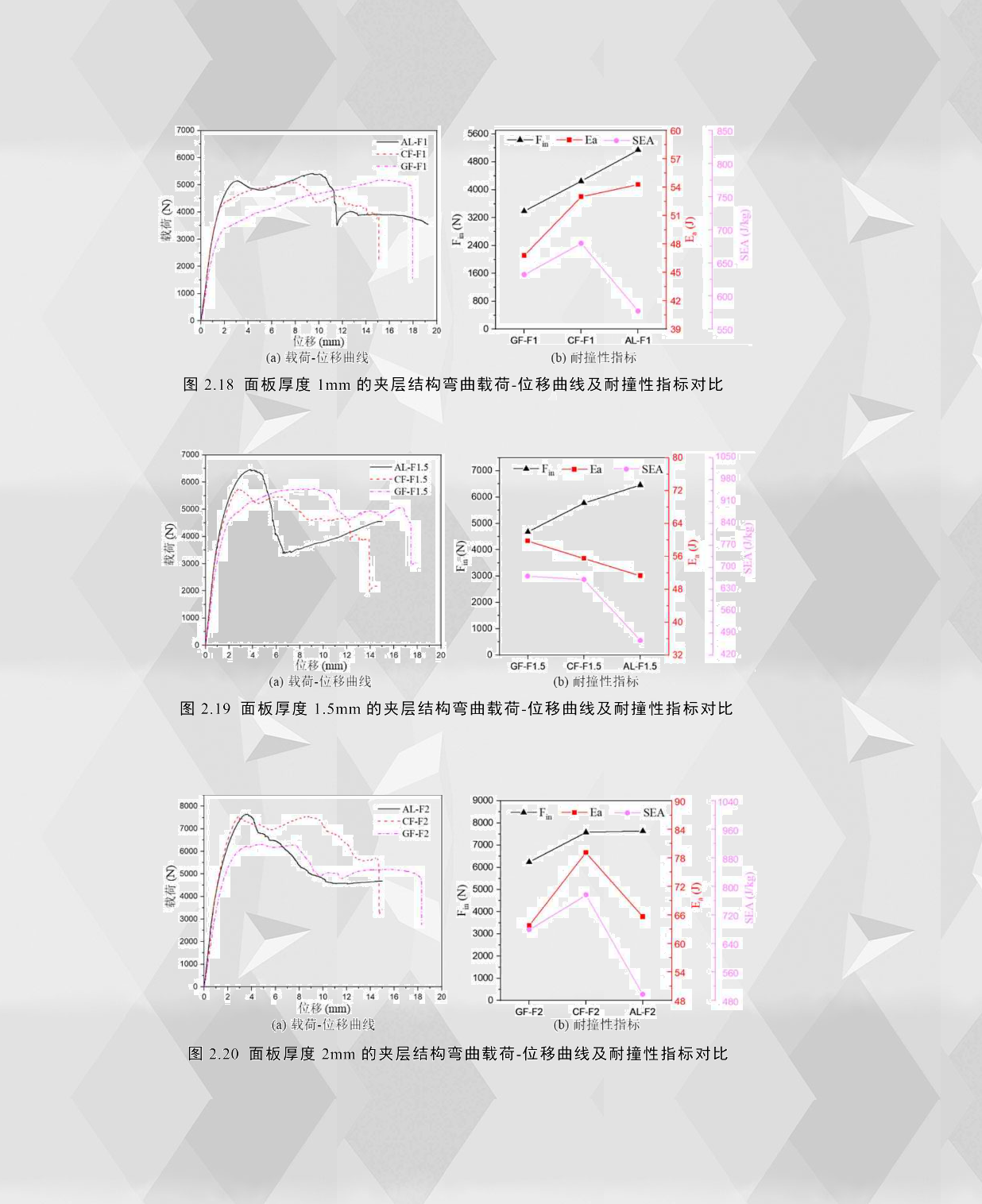 通過比較面板為1.5mm的夾層結(jié)構(gòu)載荷-位移曲線,如2.19(a)所示,纖維夾層結(jié)構(gòu)在臨界載荷后的載荷變化趨勢(shì)小于鋁合金夾層結(jié)構(gòu)的變化趨勢(shì),結(jié)合其壓潰過程,GF-F1.5的臨界失效模式為壓痕壓入(IN),其余兩者為芯層剪切(CS);GF-F1.5的臨界失效載荷最小,但吸能最多,而AL-F1.5雖有最大的臨界載荷,但吸能最少。AL-F1.5在發(fā)生芯層剪切失效之后小段位移發(fā)生了界面失效,而CF-F1.5臨界失效模式之后小段位移后還耦合了芯層泡沫壓潰,這使得AL-F1.5的載荷下降速度比CF-1.5要快。根據(jù)圖2.19(b)比較來看,從面板為GFRP到CFRP再到A16061的夾層結(jié)構(gòu)來看,其臨界載荷依次增加,而其總吸能和比吸能依次減少。
