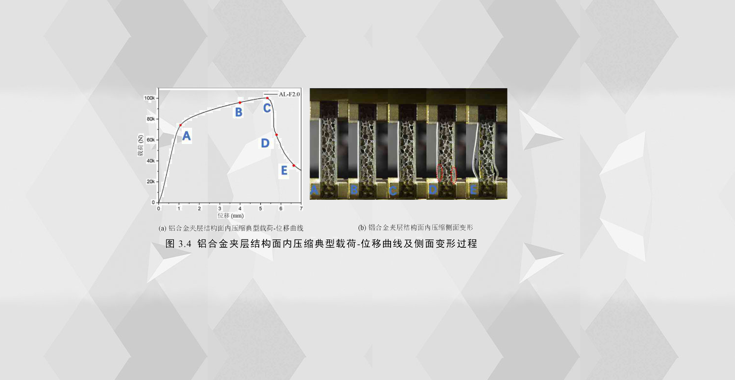 3.4(a)描繪了鋁合金夾層結(jié)構(gòu)在面內(nèi)壓縮下典型載荷-位移曲線,其壓潰過程大體可以分為三個(gè)階段,O-A彈性階段,此階段結(jié)構(gòu)處于彈性變形,載荷與位移的關(guān)系為線性增長(zhǎng);A-C塑性階段,在此階段結(jié)構(gòu)面板受到較大的壓力而產(chǎn)生塑性變形,載荷與位移仍近似呈線性增長(zhǎng)趨勢(shì),只是載荷增長(zhǎng)幅度遠(yuǎn)小于彈性階段增長(zhǎng)幅度;C之后屬于后屈曲階段,由于在此階段面板發(fā)生嚴(yán)重屈曲變形,并且面板與芯層之間的膠層出現(xiàn)大面積失效,這導(dǎo)致夾層結(jié)構(gòu)的承載能力大大降低,此外,由于泡沫芯層壓縮的效果,在面板失穩(wěn)之后夾層結(jié)構(gòu)仍有較弱的承載能力,并未完全失去承載能力,圖3.4(b)為此試件在圖3.4(a)各點(diǎn)時(shí)刻側(cè)面面板與芯層泡沫的變形圖。