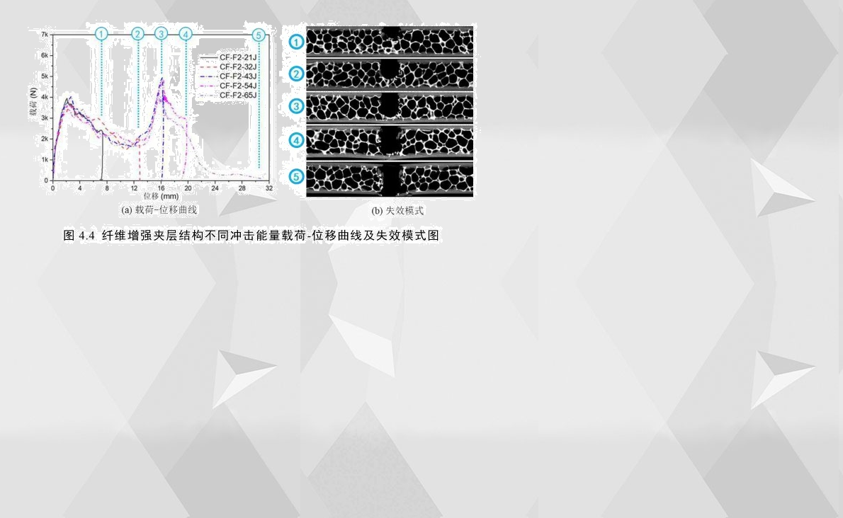 通過分析發(fā)現(xiàn),碳纖維夾層結(jié)構(gòu)和玻璃纖維夾層結(jié)構(gòu)的具備相似的沖擊失效機理,以CF-F2為例,通過其在不同沖擊速度下得到的載荷-位移曲線對比來看,如圖4.4(a)所示,當(dāng)前速度范圍的應(yīng)變率對此纖維增強夾層結(jié)構(gòu)的機械響應(yīng)影響不大,所以亦可以用不同沖擊速度下的試件最終破壞形式來分析其損傷失效機理,這與鋁合金夾層結(jié)構(gòu)的分析方法類似。通過觀察發(fā)現(xiàn),CF-F2的載荷-位移曲線和失效過程與AL-F2有很大地相似性,均存在兩個峰值載荷并且未出現(xiàn)面板與膠層失效分離。與AL-F2不同的是,由于CF-F2面板為脆性材料,其載荷達到第一次峰值載荷的位移要比AL-F2的小許多,并且CF-F2在第一階段的曲線更加接近線性增長;此外,前者在兩峰值載荷下降位置處,面板發(fā)生塑性斷裂,而后者發(fā)生脆性斷裂;由于兩者的第二階段皆以上下面板斷裂為界,所以此階段主要以泡沫芯層壓潰與芯層剪切吸能沖擊能量,通過對比兩者的第二階段,發(fā)現(xiàn)此階段兩者的位移長度基本一致。需要特別注意的是,由于CF-F2的下面板的破壞區(qū)域位置比上面板的更大,如圖4.4(b)所示,其第二峰值載荷甚至比第一峰值載荷更高。