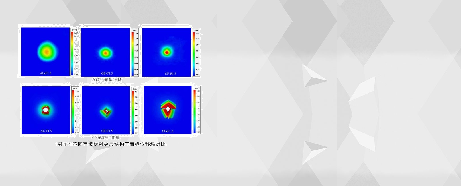 在低速沖擊實驗研究過程中,面板的變形量(尤其是下面板的變形量)對防護性能的評估極為重要,因此分析夾層結構下面板最大變形是十分必要的,圖4.7(a)為三種面板厚度為1.5mm的夾層結構在沖擊能量為41J下的下面板變形位移場;通過比較三者的變形可以看出,鋁合金夾層結構的下面板變形面積是最大的,而其沖頭垂直方向的最大變形量是最小的;此外CF-F1.5與GF-F1.5比較而言,兩者的變形面積相差不大,但前者的最大變形量更大,并且可以看到明顯的十字形裂紋。圖4.7(b)為同配置條件下的試件在穿透沖擊能量下的下面板變形位移場;可以看出,AL-F1.5的下面板變形位移場的形狀為圓形,相比之下,CF-F1.5的下面板可以看到呈菱形的穿孔且位移變形的區(qū)域比前者要大一些,此外,GF-F1.5的位移場的大小和破壞形式介于其余兩者之間。從以上的分析中也可以得出,在同等尺寸配置,鋁合金夾層結構耐沖擊性能更好,而碳纖維夾層結構的耐沖擊性能可能是最差的。
